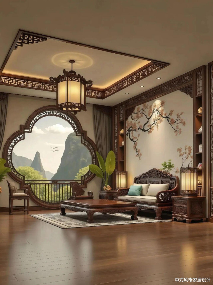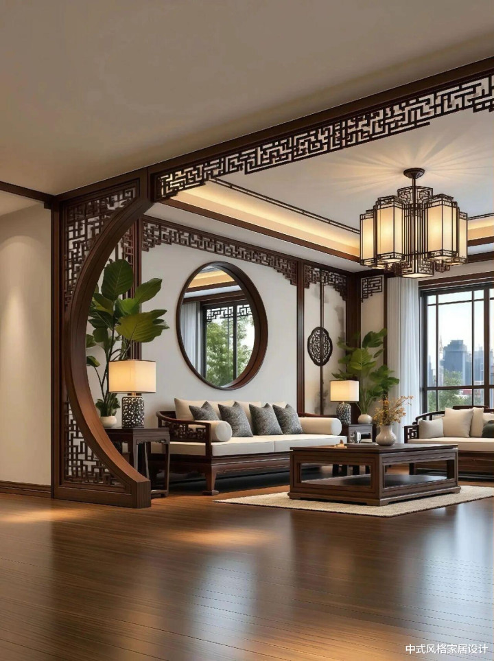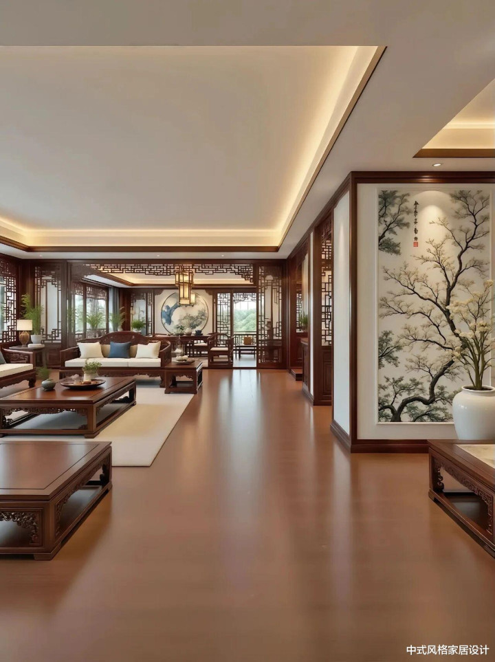以深色实木产品为基底,搭配从简线条的吊顶与镶嵌式灯光,保留“木色温润”“对称均衡”等及第经典元素,同期通过绽开式布局、通透玻璃窒碍弱化传统及第的闲静感,增强空间通透度。墙面吊挂水墨山水画,大地聘用仿古砖或实木地板,搭配绿植,呼应“天东谈主合一”的传统理念,营造宁静悠远的居住氛围。产品布局兼顾庆典感与实用性,如主沙发区对称摆放、茶几与边几组合,既得志待客需求,又通过细节障翳(如茶具、摆件)普及文化质感。