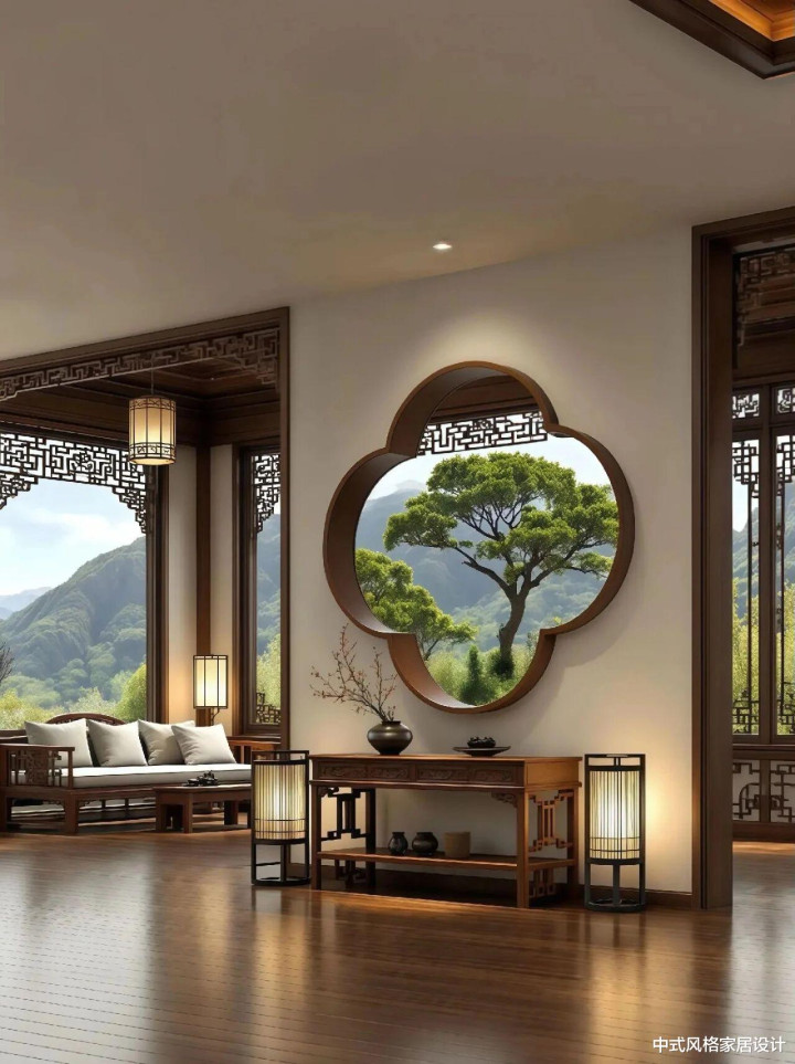墙面中央的四叶草形镂空窗模仿及第园林“框景”手法,将窗外当然景不雅引入室内;木质产品(如圈椅、长桌)保留榫卯结构,线条肤浅运动;格栅窗、灯笼造型吊灯等细节呼应传统及第记号,同期简化繁复纹饰。以原木色为基底,搭配米白墙面,局部用深色木质线条勾画综合,色调千里稳和谐;大地聘用实木地板,墙面为哑光乳胶漆,搭配棉麻质料窗帘,普及空间温润感。窗框内镶嵌山水局势画,搭配案几上的枯枝摆件,传递“天东谈主合一”理念;产品布局对称且留白,稳健及第“藏露纠合”原则,同期得志现代生存动线需求。