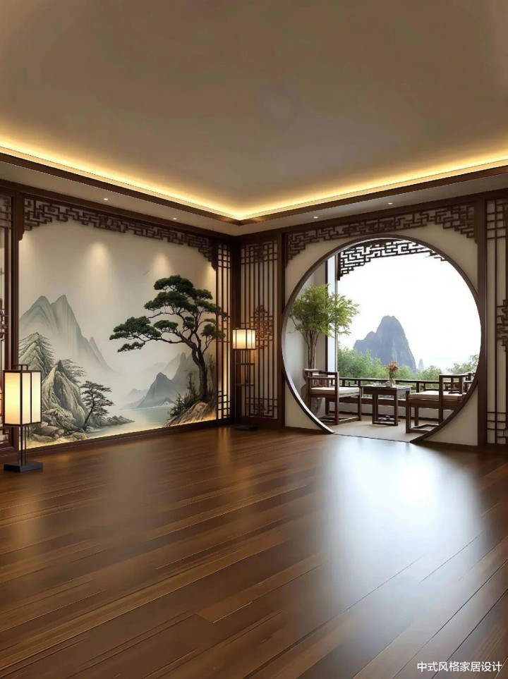 空间中央的圆形月洞门是及第盘算推算的标志性元素,聘用实木框架搭配雕花格栅,既远隔了表里区域,又通过“洞”的料想造成“一步一景”的视觉指导,呼应传统园林“移步换景”的造景理念。左侧墙面以水墨山水画为障翳,远山、孤松与留白的笔触传递出及第好意思学中的“写意”精神,搭配木质格栅与镶嵌式灯光,增强墙面的档次感与艺术氛围,与月洞门外的实景造成虚实呼应。大地聘用深色实木地板,温润的木纹与合座色调解解;顶部藏匿式灯带提供柔软照明,避将就光破损静谧感,同期凸起墙面与月洞门的细节纹理,突显传统工艺的精湛质感。