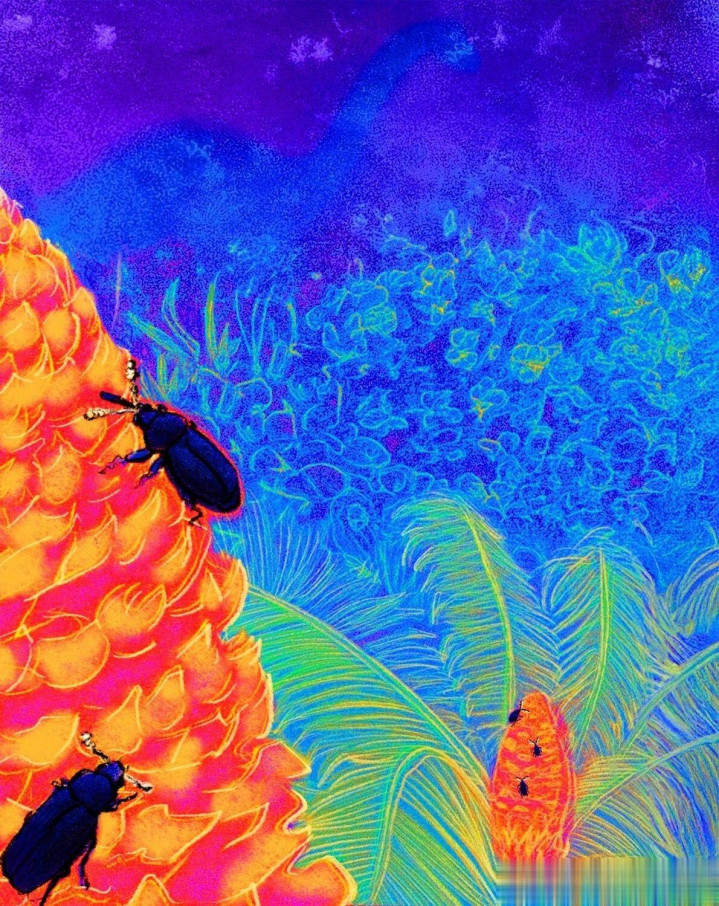 推敲到亚马孙甲虫的夜行习性,它们发展出一套不依靠颜色找路的格式也很闲居。这些甲虫还会在苏铁类的球果上产卵,发育周期十足和植物绑在一皆。温迪说得很直白,莫得甲虫就莫得植物,没了植物甲虫也活不了。