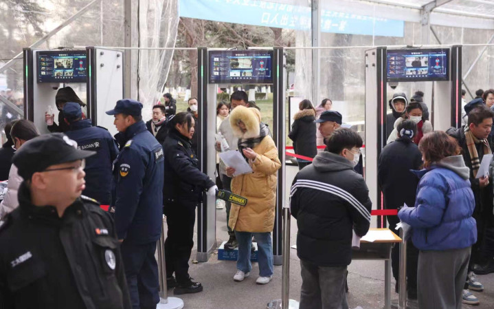 考点建立智能安检门、东说念主脸识别、手持金属探伤仪、科场智能查看系统等“六位一体”安全不竭建设模范。新京报记者李木易摄